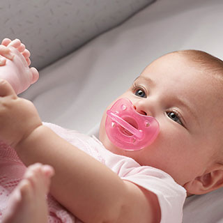 For baby’s comfort, the nipple is an extra-soft silicone with a satin-textured finish to help keep the paci in baby’s mouth for uninterrupted soothing. The soft shield of this paci is comfortable and breathable. Ventilation holes promote air circulation, helping to reduce moisture buildup on baby’s soft, sensitive skin. The soft handle of this one-piece construction pacifier is big enough for baby to grab and easy to attach to a cute paci holder.
